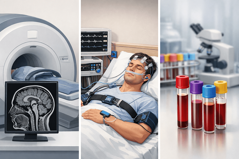 تشخیص دقیق نیازمند معاینه تخصصی، MRI، آزمایش خون و گاهی تست خواب است.